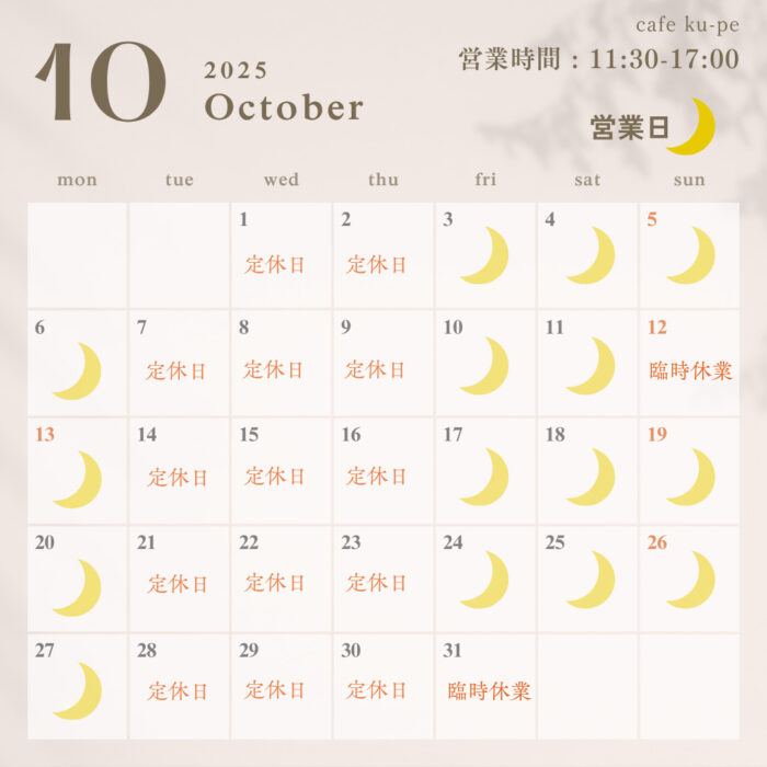 HOME > ニュース > ニュース 10月営業スケジュール 投稿日:2025年10月3日 【臨時休業】 12日㈰ 31日㈮ 【イベント】 11日㈯サーシャ鑑定/満席 18日㈯音楽瞑想会/満席 19日㈰カラー&メイク講座/満席 20日㈪美容鍼/満席ランチは前日までご予約をお願い致します。ご予約 - cafe ku-pe10月も皆様のお越しを心よりお待ちしております。 Twitter シェア Google+ Pocket B!はてブ LINE -ニュース