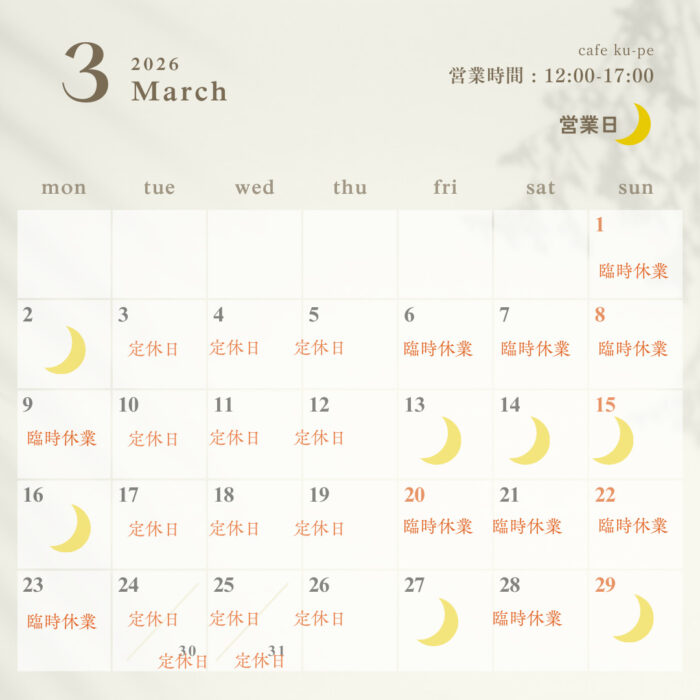 HOME > ニュース > ニュース 3月スケジュール 投稿日:2026年2月26日 3月の営業スケジュールです。とてもお休みが多くなっています。ご迷惑をおかけします。 よろしくお願いいたします。 Twitter シェア Google+ Pocket B!はてブ LINE -ニュース